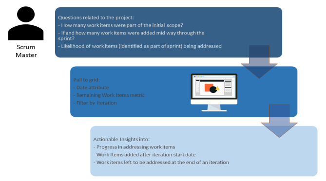 As a Scrum Master, he wants to understand how teams are progressing in any given sprint. It is critical for him to know how many items were part of the initial scope, if and how many work items were added half-way through the sprint, if the teams are making expected progress in addressing the work items, and so on. Using this data, he charts a burn down graph at the end of every sprint which will help him analyze important project data such as: